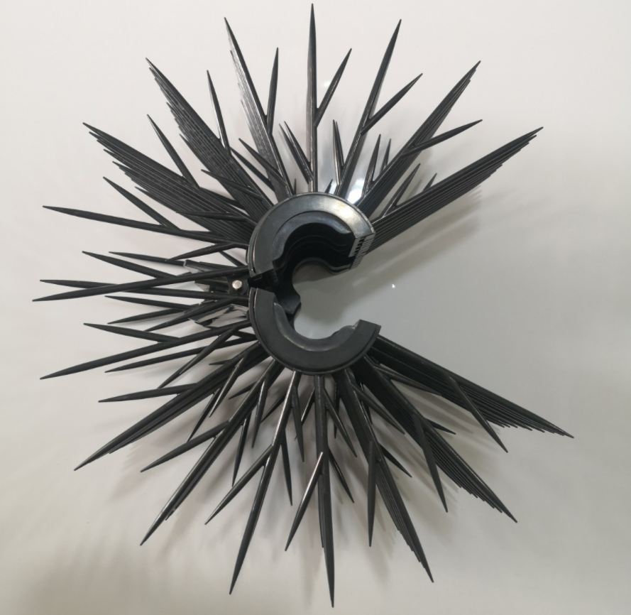 帶電安裝防鼠裝置主要由防翻越尖刺,固定夾具,旋轉殼體,自閉合開關等部件組成,裝置的異步同體結構和 360旋轉設計原理能有效拒止由線路和輔助設施向開關方向移動的小動物或藤曼的靠近。